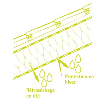 INTELLO fonctionne selon le principe de la membrane hygrovariable : En hiver, INTELLO réduit fortement la pénétration de la vapeur d’eau dans les constructions avec une valeur sd avoisinant les 25 m (transport de l’humidité inférieur à 7 g/m² par semaine). En été, l’écran permet une évacuation de l’humidité exceptionnellement élevée de plus de 500 g/m² par semaine. L’isolation est toujours séchée en cas d’humidité inattendue : les moisissures n’ont aucune chance !