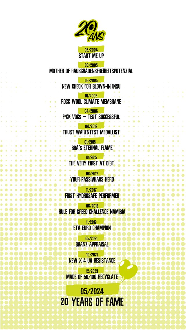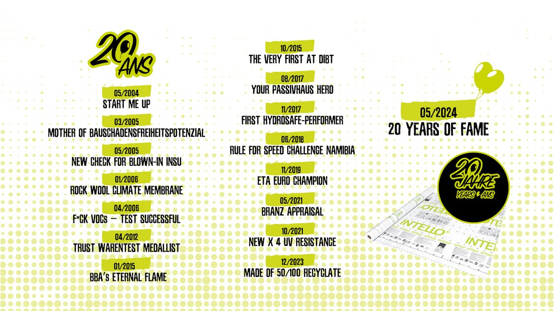 Moqué par beaucoup au départ, un frein-vapeur avec une résistance à la diffusion de vapeur d’eau hygrovariable est venu révolutionner le monde de la construction dans les années 2000. Récompensé par la Stiftung Warentest, intégré dans le cadre reconnu des règlementations techniques, premier frein-vapeur hygrovariable marqué par une ETA, certifié selon la norme pour les maisons passives, il affiche également les meilleurs résultats dans le test des polluants. Le frein-vapeur INTELLO est également sous Avis Technique du CSTB. Aujourd’hui, 20 ans après son lancement, il est présent dans des millions de projets, de la mini-maison à la tour d’immeuble, dans les plafonds, les toits et les murs, partout où l’on trouve une couche d’étanchéité à l’air à la qualité inégalée.