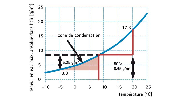fig. : Dans des conditions climatiques standard (20 °C / 50 % d'humidité relative de l'air), le point de rosée est atteint à 8,7 °C. Avec une température de l'air extérieur de -5 °C, la condensation est de 5,35 g/m³ d'air.