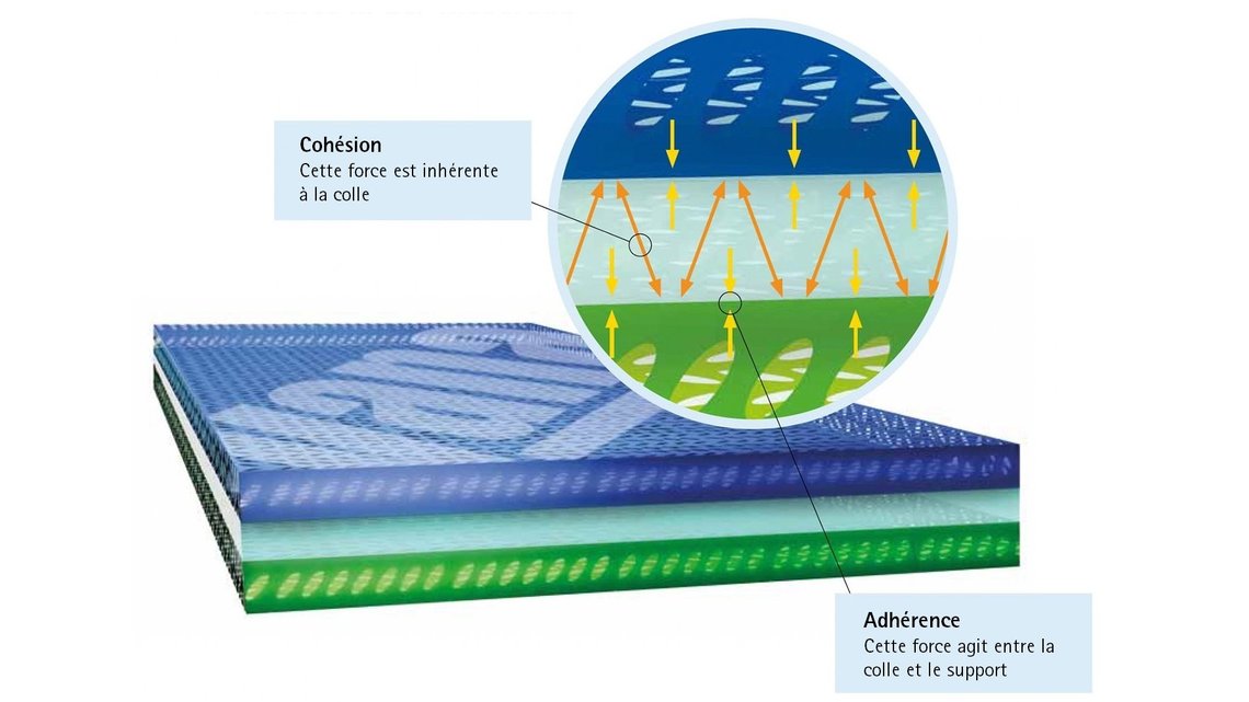 La colle présente une adhérence suffisante sur le support. Mais le pouvoir adhésif dans le joint est trop faible, de sorte que même en cas de faibles charges, la colle peut déjà s’étirer lentement. Elle laisse alors un film de colle sur les deux surfaces. Cela peut être l’indice d’une cohésion trop faible.