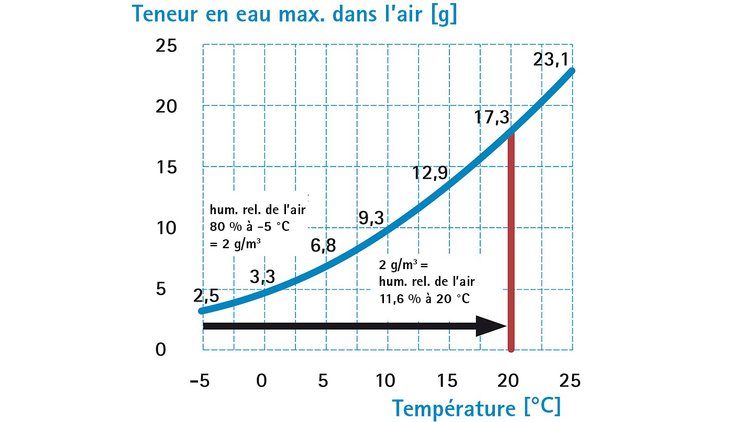 Exemple : Un air froid à -5 °C peut, à un taux d’humidité relatif de 80 %, contenir au maximum 2 g/m³ d’humidité (climat hivernal extérieur). Lorsque cet air est réchauffé à 20 °C (climat hivernal intérieur), l’humidité relative de l’air tombe à 11.6 %.