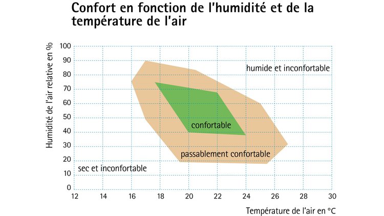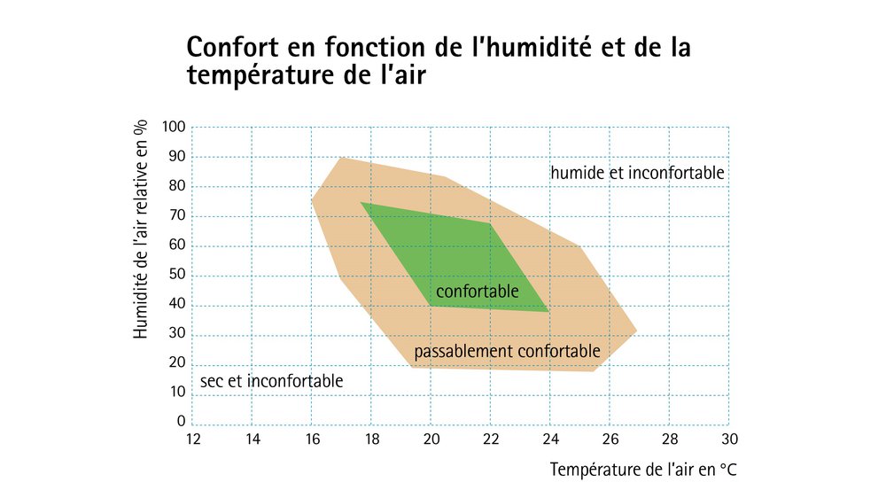 Les habitants d’Europe centrale et du Nord se sentent à l’aise en hiver avec une humidité relative de l’air entre 40 % à 60 % pour des températures ambiantes comprises entre 20 °C et 23 °C. Nous ne disposons toutefois pas d’organe sensoriel propre pour ressentir directement l’humidité relative. Des ressentis secondaires fiables, comme la transpiration ou la sensation de moiteur, nous font néanmoins rapidement sentir si quelque chose ne va pas. Par exemple, la sécheresse des muqueuses nous indique en hiver que l’humidité de l’air ambiant est trop faible et qu’il faut agir. La raison pour laquelle l’air ambiant est trop sec en hiver est souvent une étanchéité à l’air inadéquate, ce qui peut même causer des maladies.