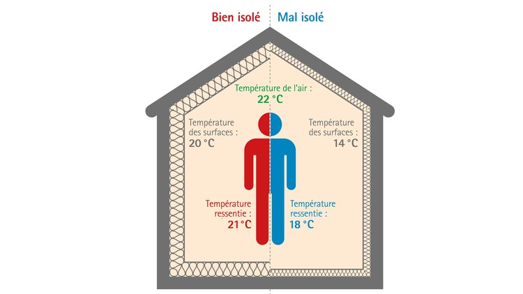 On sous-estime souvent le fait que la température des parois d’une pièce joue un rôle important sur notre degré de bien-être. Nous sommes en effet dans un échange permanent de rayonnement avec ces surfaces. Pour le confort thermique, les surfaces des fenêtres, murs, plafonds et sols devraient être comprises entre 18 °C et 19 °C. Les écarts de température entre les différents éléments de construction devraient être aussi faibles que possible. Cela permet également d’éviter l’apparition de courants d’air désagréables.
