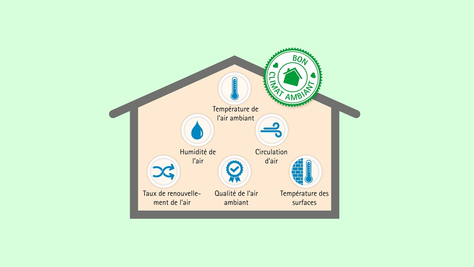 Pour se sentir bien dans des pièces fermées, nous avons besoin d’un bon air ambiant. Il doit avoir une odeur neutre, et contenir beaucoup d’oxygène et peu de polluants. Les polluants, tels que les COV, peuvent être libérés dans l’air ambiant, par exemple, par des produits de construction, des produits de nettoyage ou des meubles. Pour un air ambiant de bonne qualité, il faut donc utiliser exclusivement des produits de construction testés et homologués indépendamment. Une aération suffisante est également importante. L’être humain ressent déjà son air comme vicié à partir d’une concentration en CO₂ d’environ 0,1 % à 0,15 %. Les concentrations d’environ 2 % sont tolérables sur le court terme. Entre 3 % et 4 %, des difficultés respiratoires apparaissent.