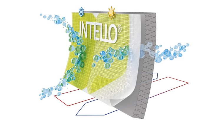Avec le DB+, pro clima a été la première entreprise à développer un frein-vapeur vec une résistance à la diffusion de vapeur d’eau hygrovariable. Bientôt, le frein-vapeur haute performance hygrovariable INTELLO a suivi. Comme DB+, INTELLO fonctionne selon le principe de la membrane hygrovariable, mais de manière encore plus performante. En hiver, INTELLO réduit fortement la pénétration de la vapeur d’eau dans les constructions avec une valeur sd avoisinant les 25 m (transport de l’humidité inférieur à 7 g/m² par semaine). En été, INTELLO permet une évacuation de l’humidité exceptionnellement élevée de plus de 500 g/m² par semaine. Le frein-vapeur hygrovariable résout ainsi rapidement, facilement et sans grand effort le problème de l’exposition à l’humidité dans la construction et réduit le risque de dégâts causés.