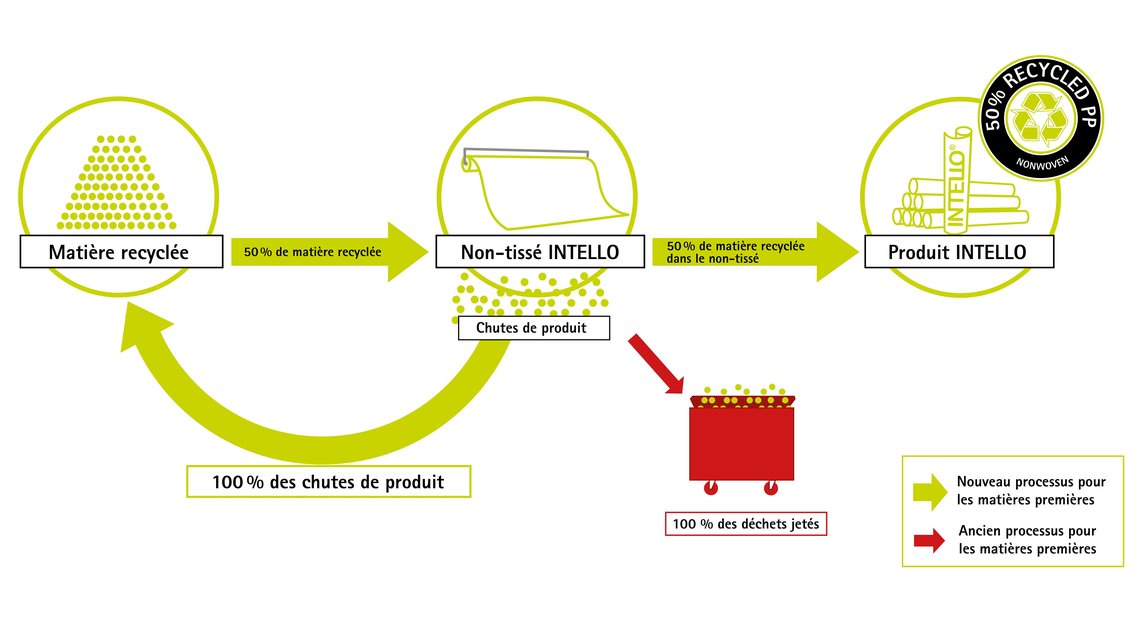 Les chutes de haute qualité générées par la production de non-tissé sont une matière première secondaire précieuse. Elles affichent une qualité constante et élevée par rapport au plastique vierge, avec une différence décisive : elles soulagent notre environnement. En effet, 50 % de nouveau matériau en moins signifie également moins de livraisons. Les matières recyclées sont traitées directement sur place, ce qui permet d’économiser de l’énergie, mais surtout des matières premières non renouvelables. Bien sûr, cette optimisation allège également la charge côté élimination des déchets. Plus de recyclage signifie également moins de déchets. De plus, les chutes ainsi que les quantités entrantes et sortantes sont des matières premières précieuses. Ici aussi, la suppression des trajets d’élimination des déchets entraîne des économies de carburant. Et le meilleur dans tout cela : le non-tissé et donc le produit fini INTELLO et INTELLO PLUS continuent d’offrir la même qualité, la même durabilité et les mêmes caractéristiques.