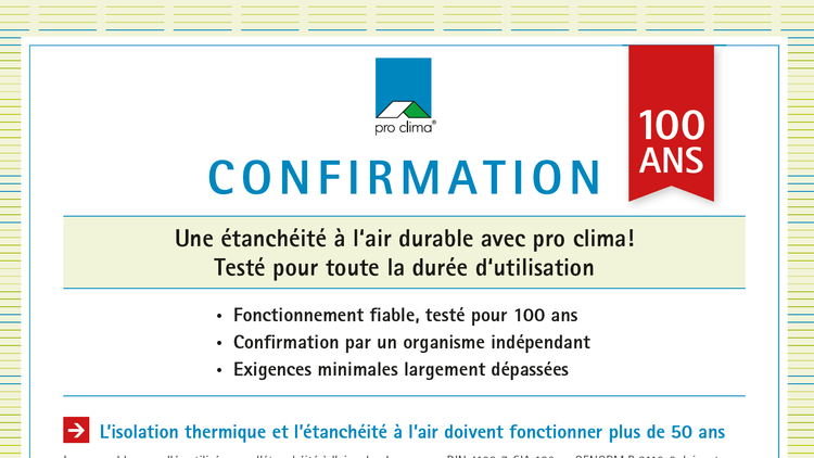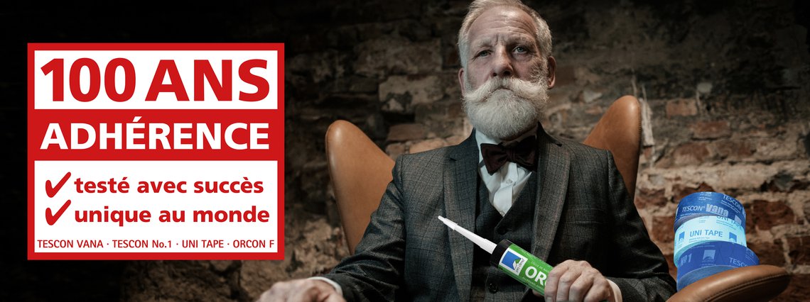 Pour une meilleure garantie à cet égard, nous avons chargé l’Université de Kassel de soumettre nos rubans adhésifs TESCON VANA, TESCON n°1 et UNI TAPE ainsi que la colle de raccord ORCON F à un test indépendant. Ce dernier atteste un fonctionnement et un pouvoir adhésif de 100 ans uniquement aux trois rubans adhésifs et à la colle de raccord de pro clima. Une longévité unique au monde. Ainsi, les constructions restent fiables à long terme.