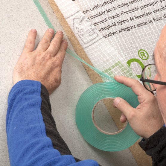 Collage de raccords étanches au vent des écrans de sous-toiture de qualité commerciale (notamment en PE et PET), par exemple : collages des raccords en combinaison avec la série SOLITEX MENTO, SOLITEX QUANTHO, SOLITEX ADHERO et SOLITEX UM connect.
