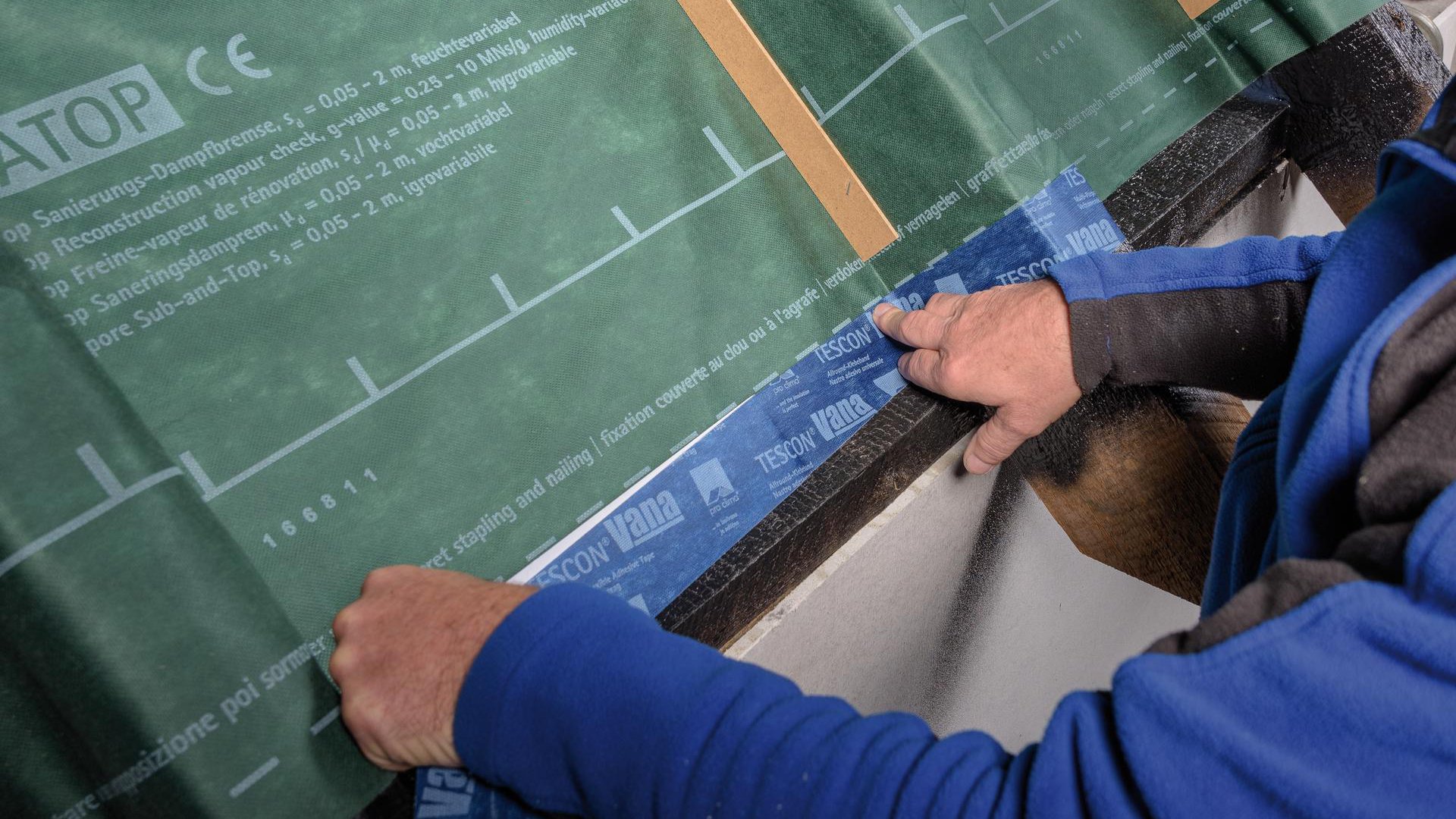 Les supports rugueux ou poussiéreux peuvent être préparés avec AEROSANA VISCONN pour le collage ultérieur des rubans adhésifs pro clima.