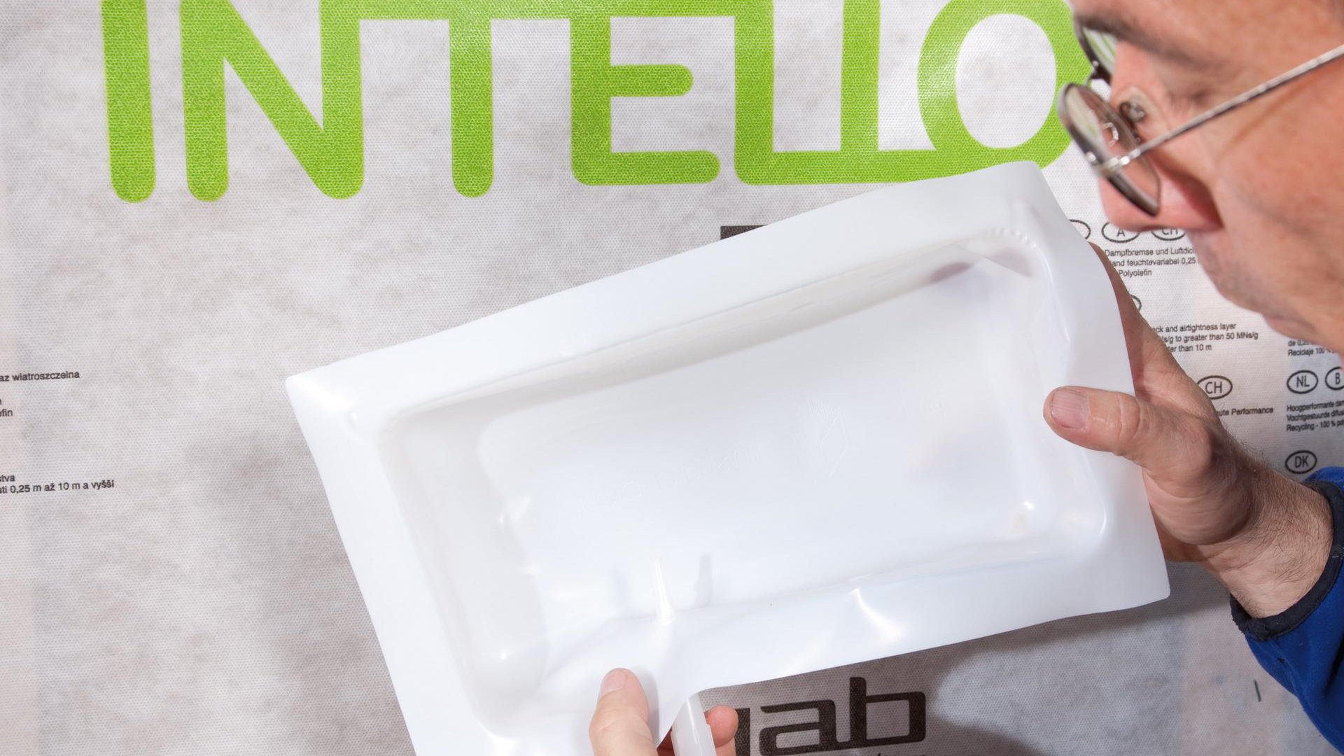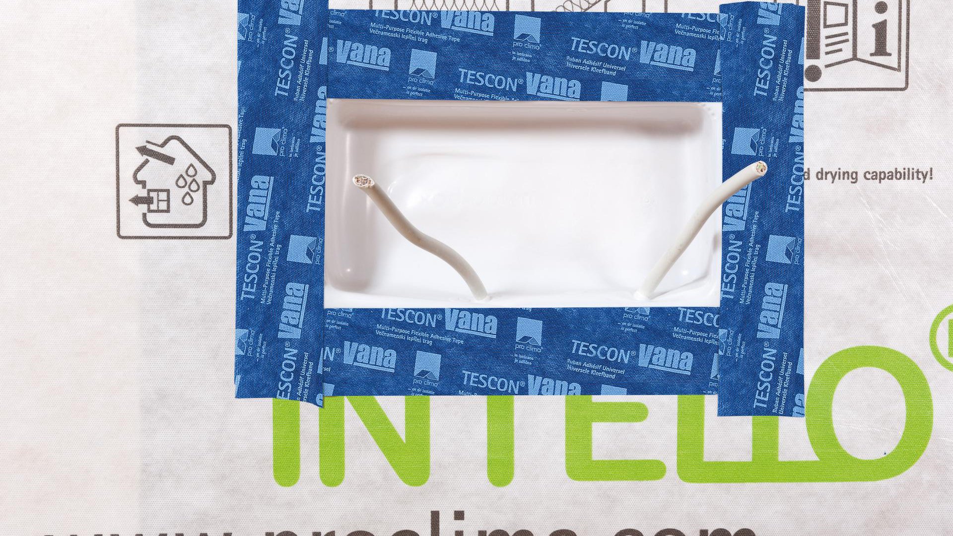 À l’aide d’un des rubans adhésifs pro clima (par exemple TESCON VANA), réaliser le collage étanche à l’air du pourtour du boîtier et bien maroufler (PRESSFIX).