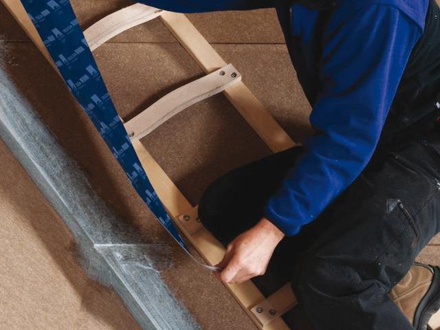 Appliquer la sous-couche TESCON PRIMER sur les panneaux en fibres de bois, coller le ruban adhésif tout usage TESCON VANA sur la sous-couche humide et l’écran de sous-toiture.