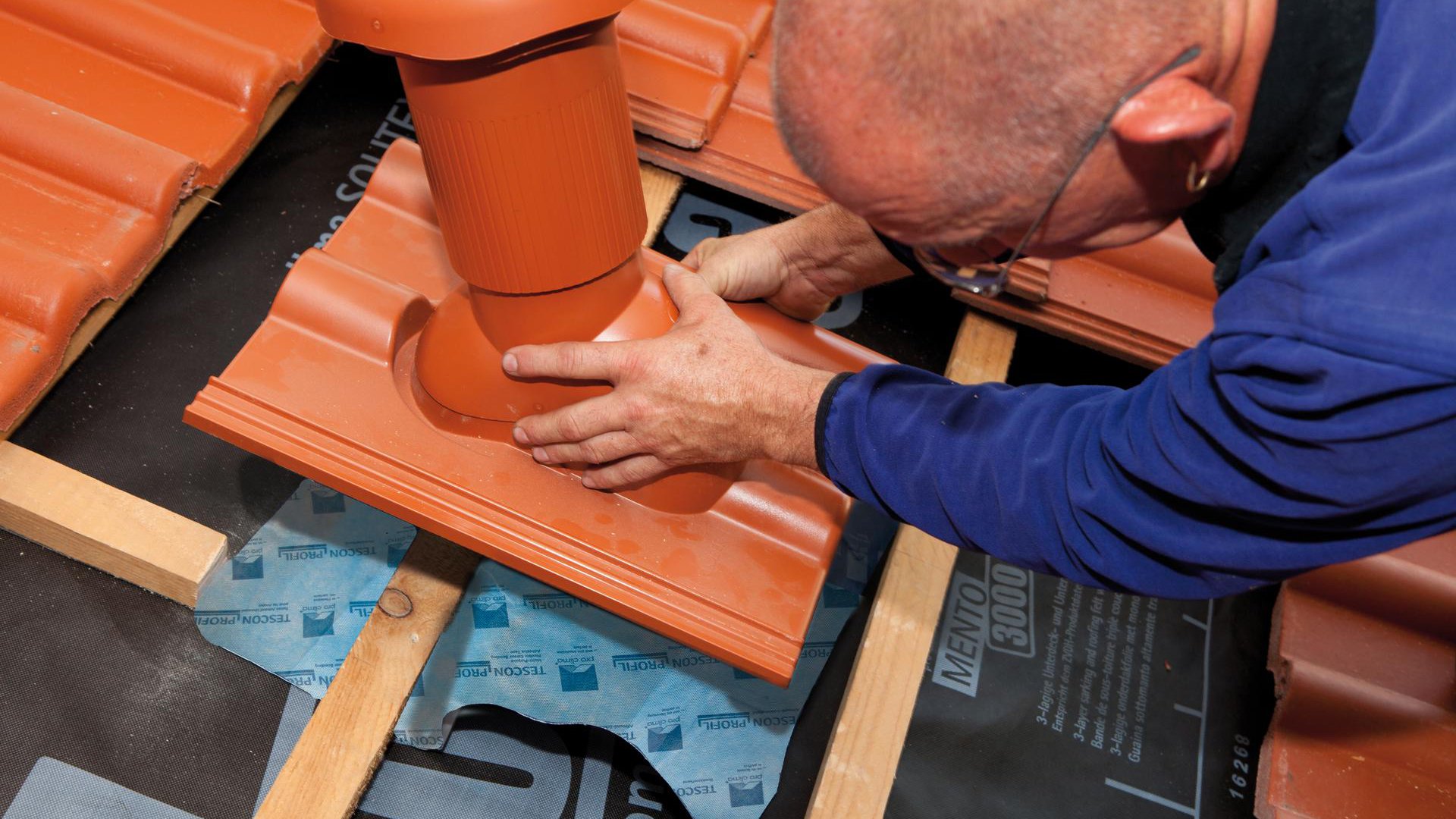 Les conduits d’aération et percements ronds similaires sont raccordés au panneau renforcé avec la sous-couche, à l’aide des manchettes d’étanchéité en EPDM ROFLEX et du ruban adhésif TESCON VANA ou à l’aide de ROFLEX exto.