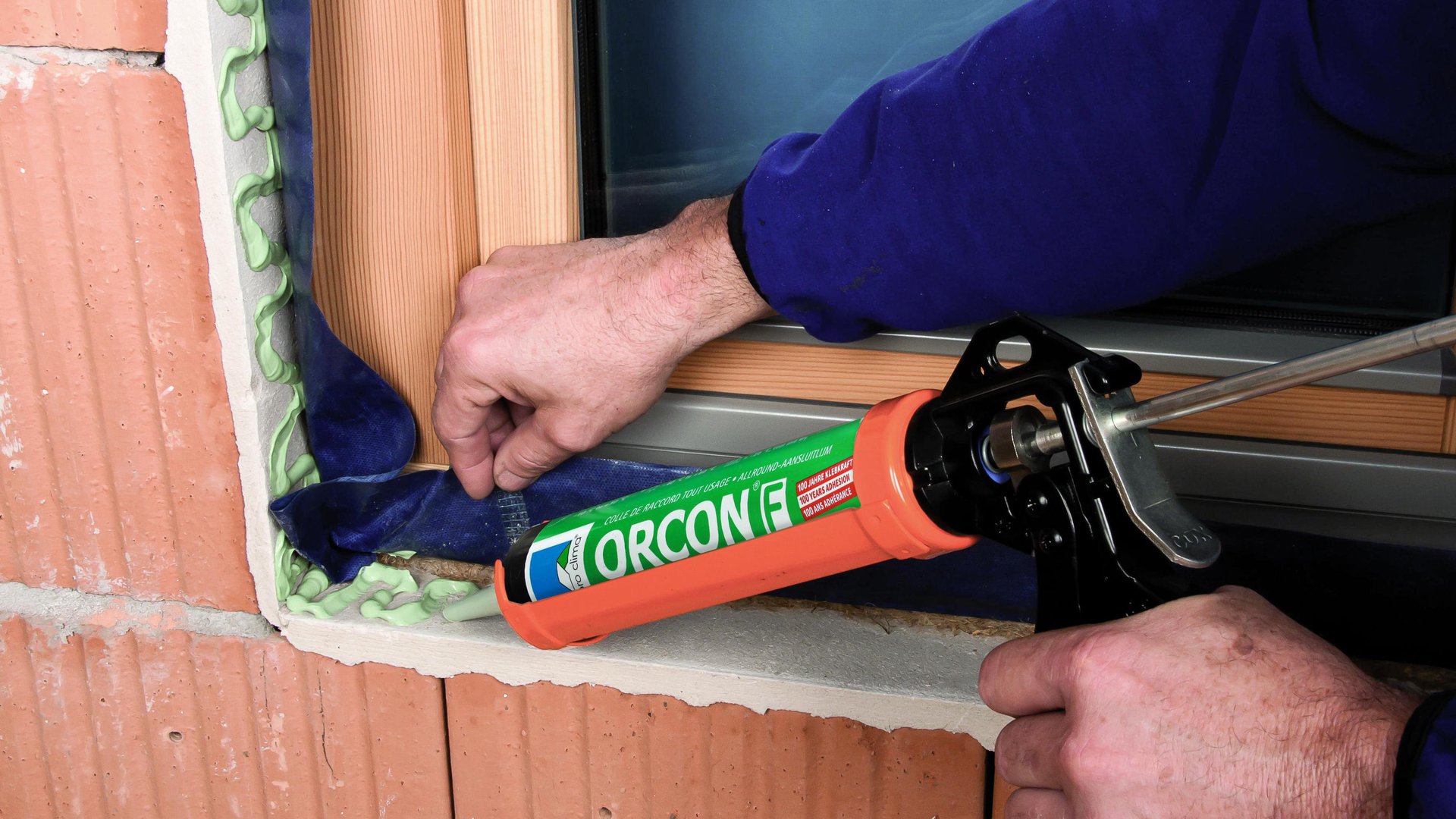 Mettre en place la fenêtre, puis appliquer sur tout le pourtour de l’ébrasement un cordon de colle raccord ORCON d’une largeur d’environ 5 mm en serpentins serrés et poser le ruban dans la colle, de manière à réaliser un raccord étanche à l’air.