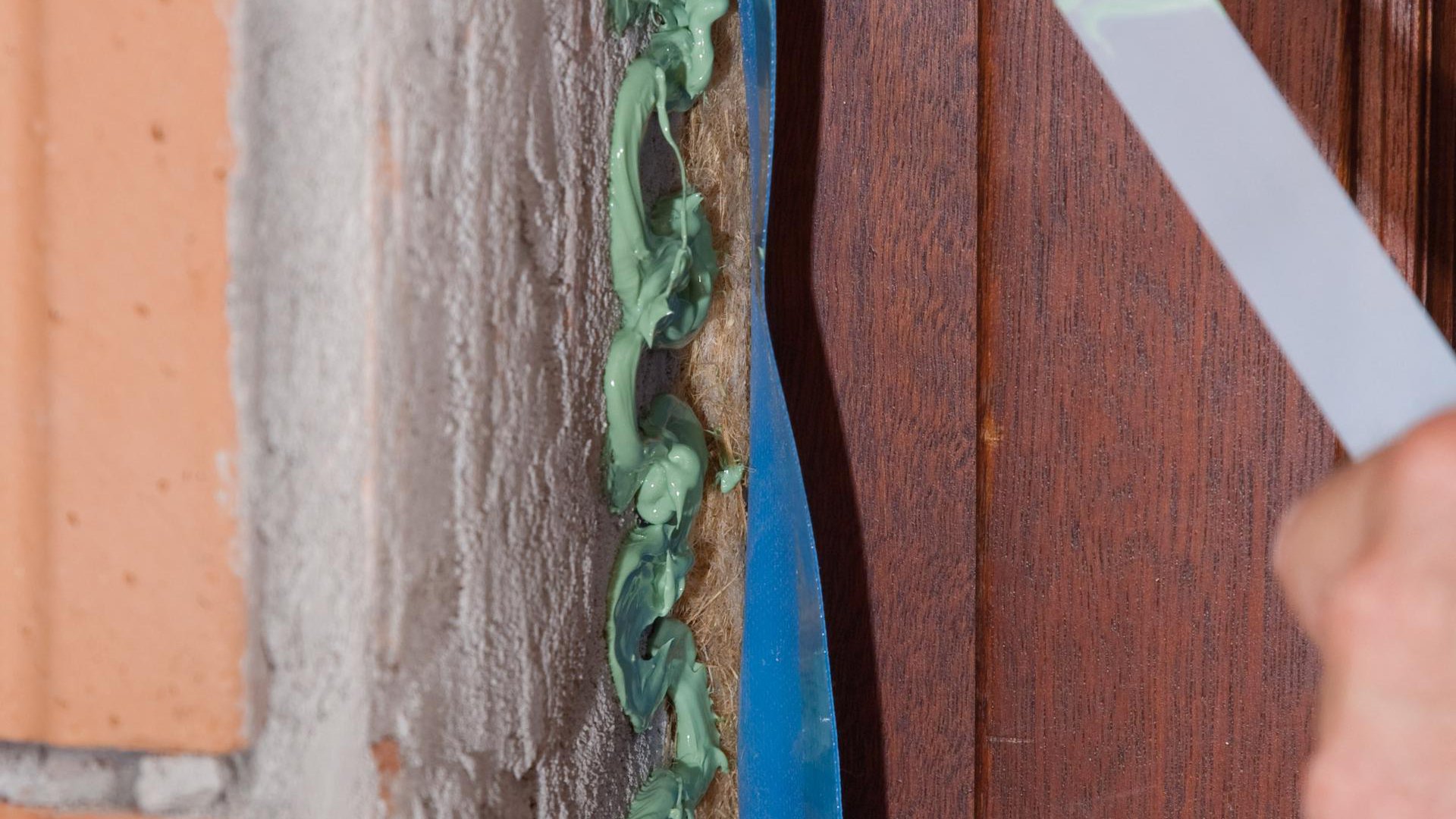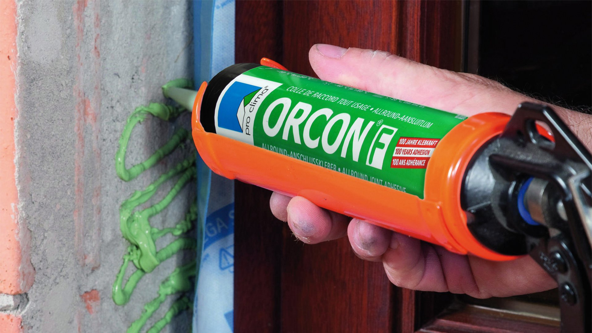 Appliquer le cordon de colle de raccord ORCON F en serpentins sur l’ébrasement, avec un diamètre d’environ 5 mm (éventuellement davantage en cas de supports très rugueux).