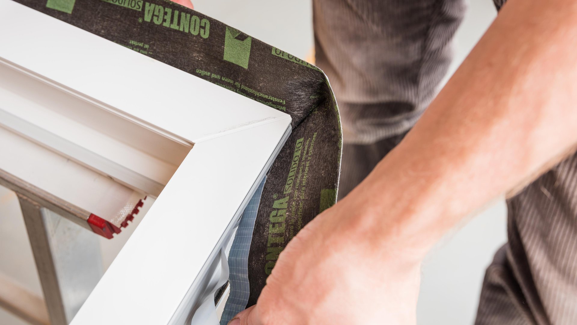 Pour permettre ultérieurement un collage facile et fiable du ruban dans l’embrasure de la fenêtre, réalisez les plis dans les coins comme illustré ici et collez CONTEGA SOLIDO IQ-D sur le pourtour.