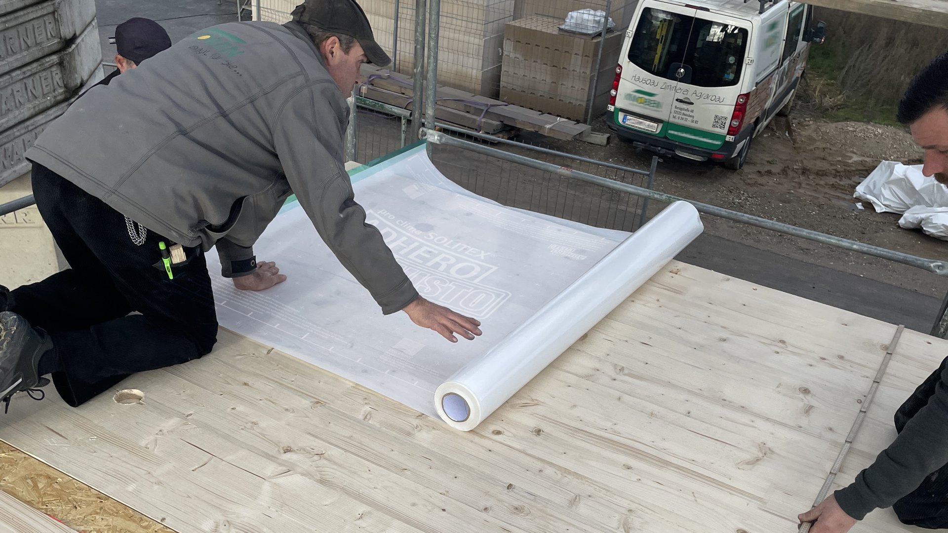 Poser SOLITEX ADHERO VISTO au niveau du marquage, l’aligner exactement en longueur et coller les premiers 25 cm du lé au support.
