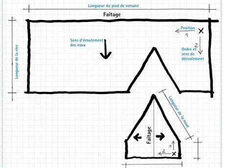 Sur votre plan, veuillez marquer la position de votre faîtage par une ligne et le sens d’écoulement des eaux par une flèche.