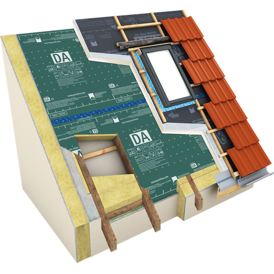En plus, la membrane DA peut s’utiliser comme frein-vapeur et membrane d’étanchéité entre deux couches d’isolation pour la rénovation. Tous les matériaux isolants fibreux peuvent être utilisés comme isolation entre chevrons ; l’isolation de la toiture par l’extérieur doit se composer d’un isolant en mousse synthétique (PUR, PIR, EPS, etc.). Le recouvrement supérieur de la paroi se fait alors avec un écran de sous-toiture hautement perméable à la vapeur d'eau (p. ex. SOLITEX MENTO 3000).