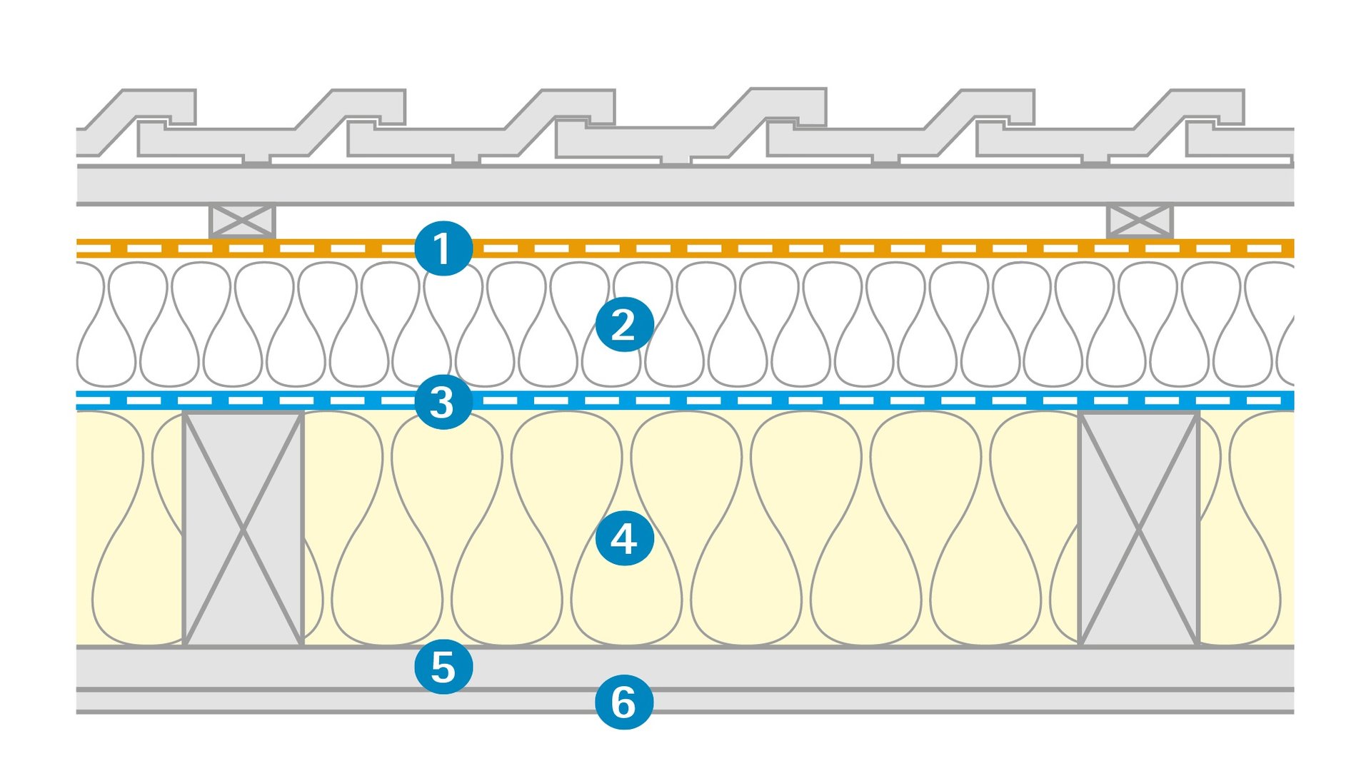 - lors d’une rénovation de la toiture par l’extérieur entre deux couches d’isolation ; isolation entre chevrons : tous les isolants fibreux – isolation de la toiture : isolant en mousse expansée (par ex. PUR, PIR, EPS) ; modélisation nécessaire