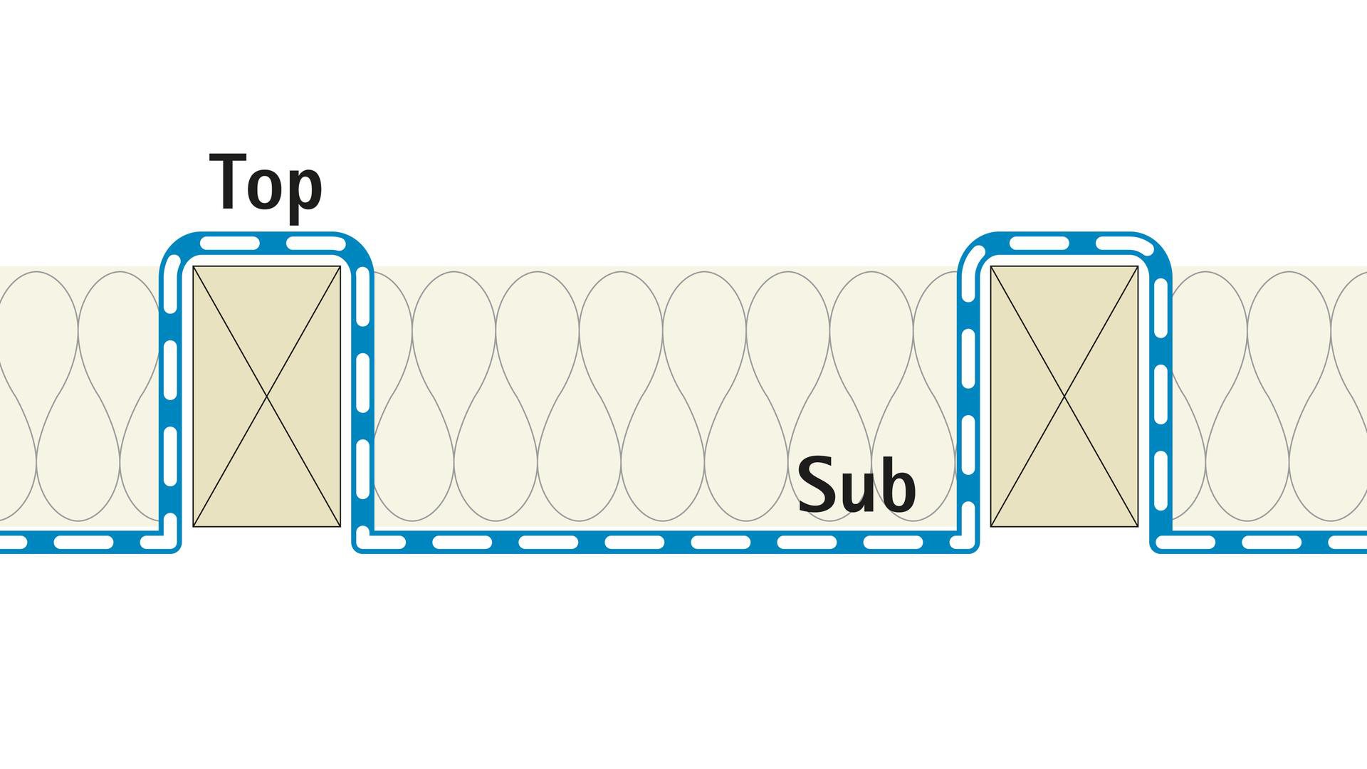 Selon la norme DIN 4108-3, convient comme frein-vapeur et membrane d’étanchéité à l’air à poser par l’extérieur sur le parement intérieur, parallèlement à l’égoût, en épousant la forme des chevrons, pour toutes les toitures pourvues d’écrans de sous-toiture (par exemple SOLITEX). La valeur Sd de l’écran de sous-toiture sur un éventuel voligeage doit être de 0,2 m maximum. Convient en outre en combinaison avec les panneaux de sous-toiture en fibres de bois et MDF ainsi que les isolants en mousse synthétique revêtue de non-tissé (PUR, PIR, EPS, etc.) à partir d’une épaisseur de 50 mm.