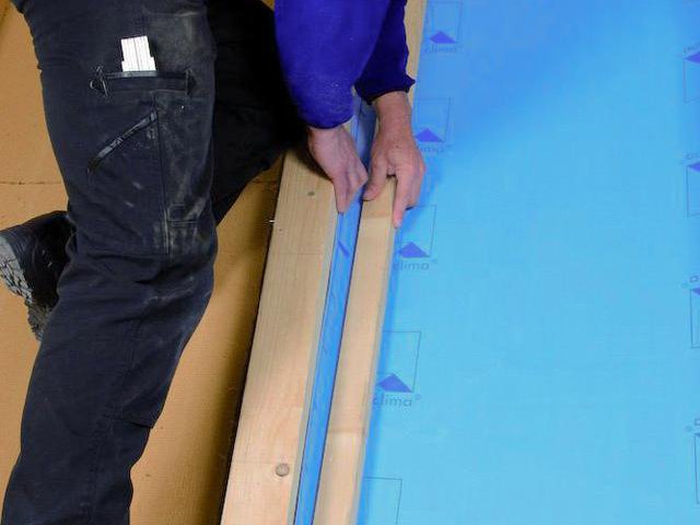 Dérouler la membrane parallèlement au chevron, l’aligner, la faire remonter sur 3 à 4 cm sur le flanc du chevron et la pousser soigneusement dans les coins, à l’aide d’une latte.