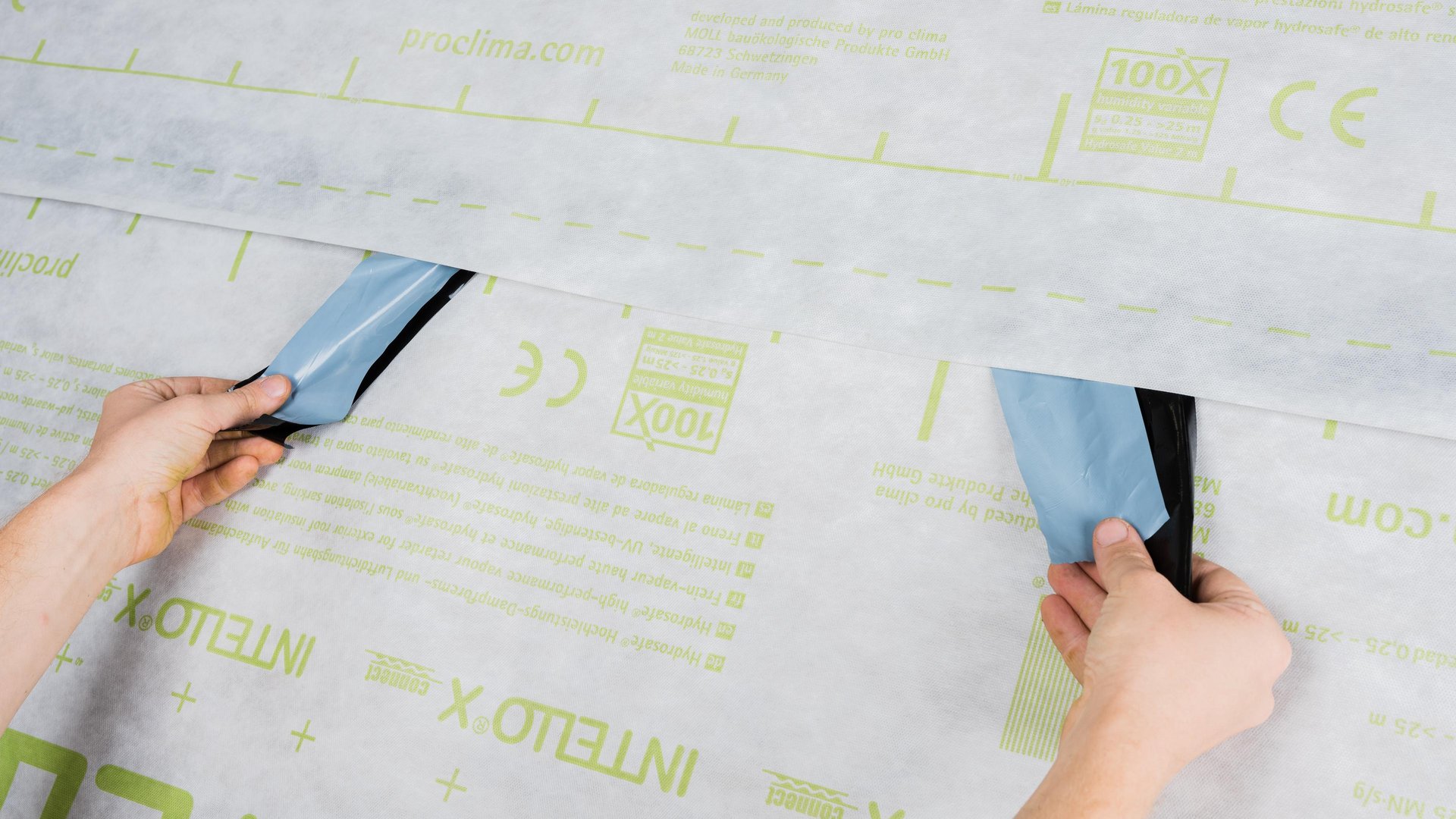 Poser à plat la membrane INTELLO X sur les chevrons et l’isolation, puis la fixer à l’aide d’agrafes galvanisées d’au moins 10 mm de large et 8 mm de long, dans la zone de chevauchement protégée de l’humidité. Les agrafes, installées avec un écart de 10 à 15 cm sur les chevrons, doivent être recouvertes de rubans adhésifs hors la zone de chevauchement s’il est prévu d’utiliser l’écran comme couverture provisoire. Laisser dépasser la membrane d’environ 4 cm sur les éléments de construction attenants, afin de pouvoir y réaliser ultérieurement un raccord étanche à l’air.