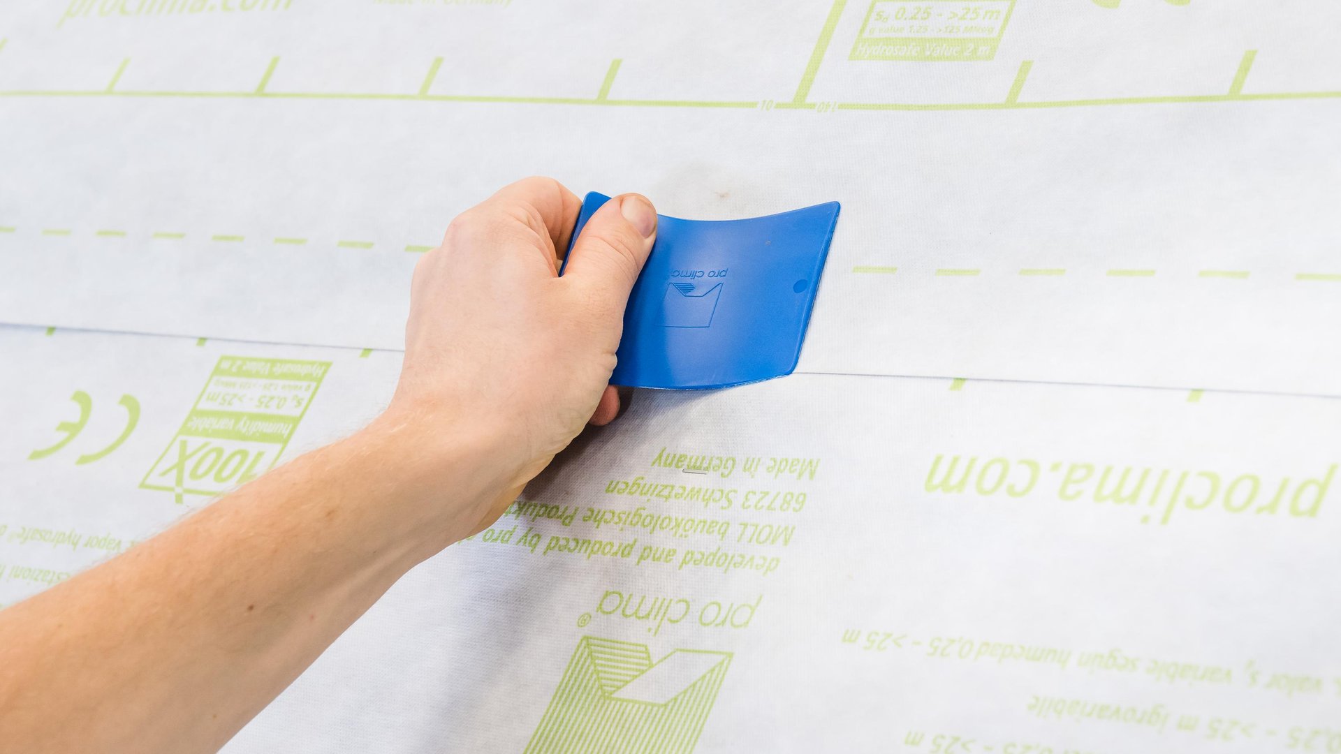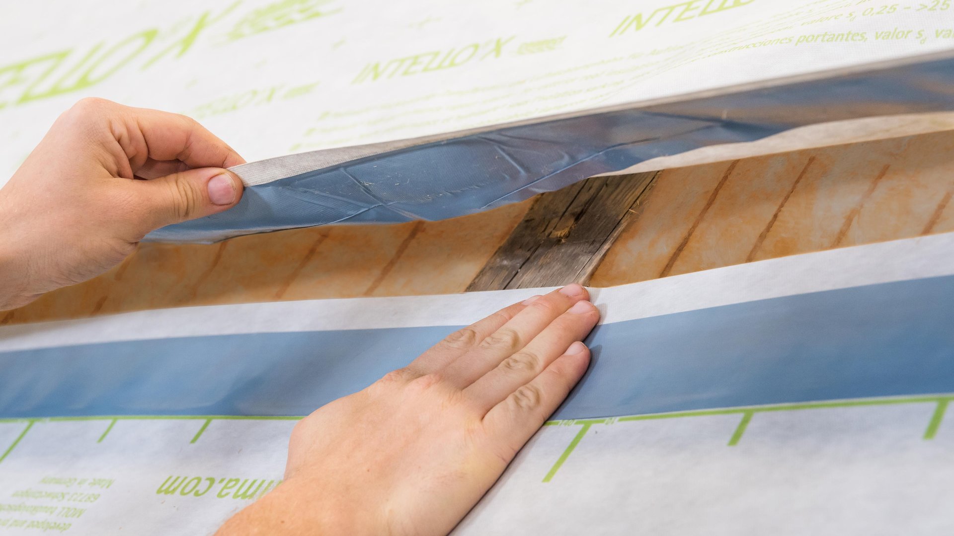 Coller les angles avec le ruban adhésif TESCON VANA. Prétraiter le vieux bois (et le bois brut de sciage) ou les murs de pied-droit avec la sous-couche TESCON PRIMER RP ou TESCON SPRIMER.